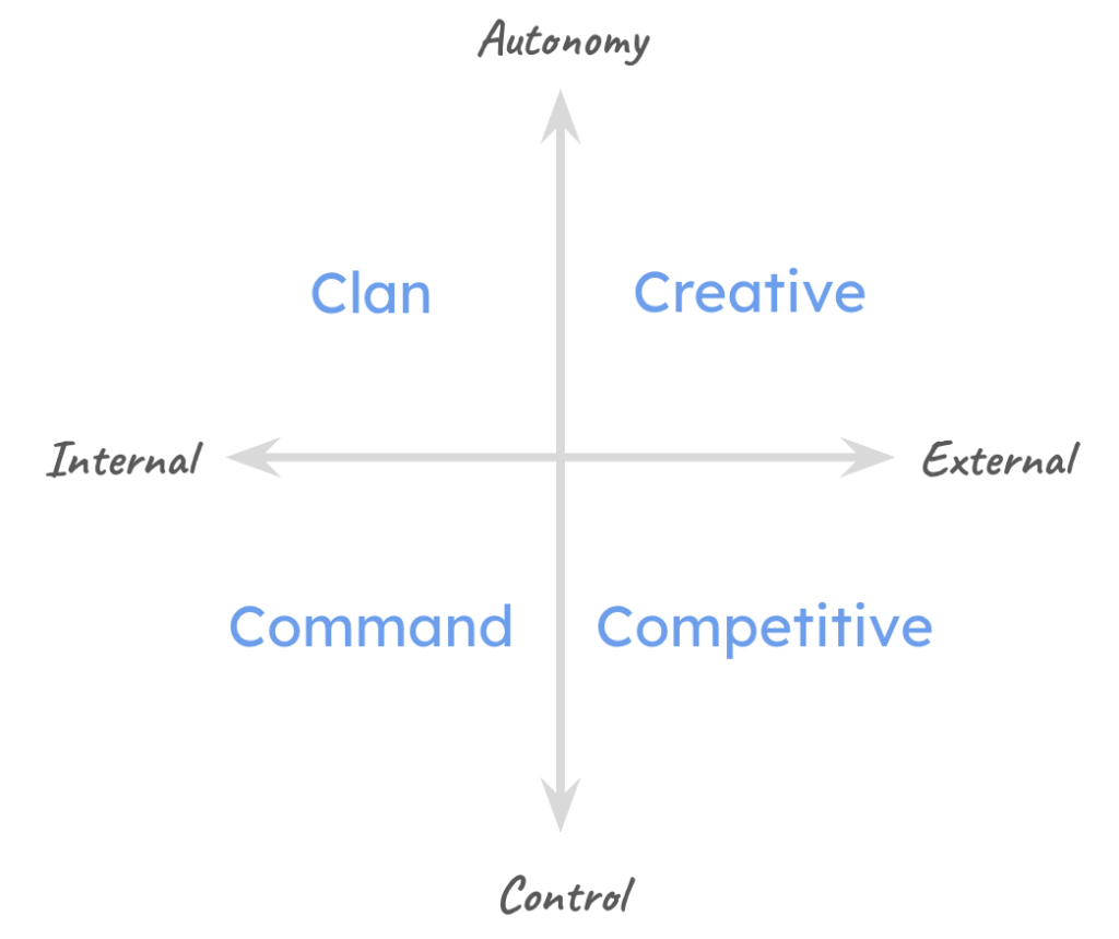 If you dig around for frameworks on company cultures, you’ll find a lot. People, particularly consultants, have developed various ways to analyze (and inflect) culture. I suppose this isn’t surprising since “culture” is both complex and vague. Different ways to dissect may be more effective based on needs. Are you trying to create more cohesion between very different functions within a company? Are you looking to drive strong alignment between top leadership and the teams on the ground? Are you driving a deep transformation?